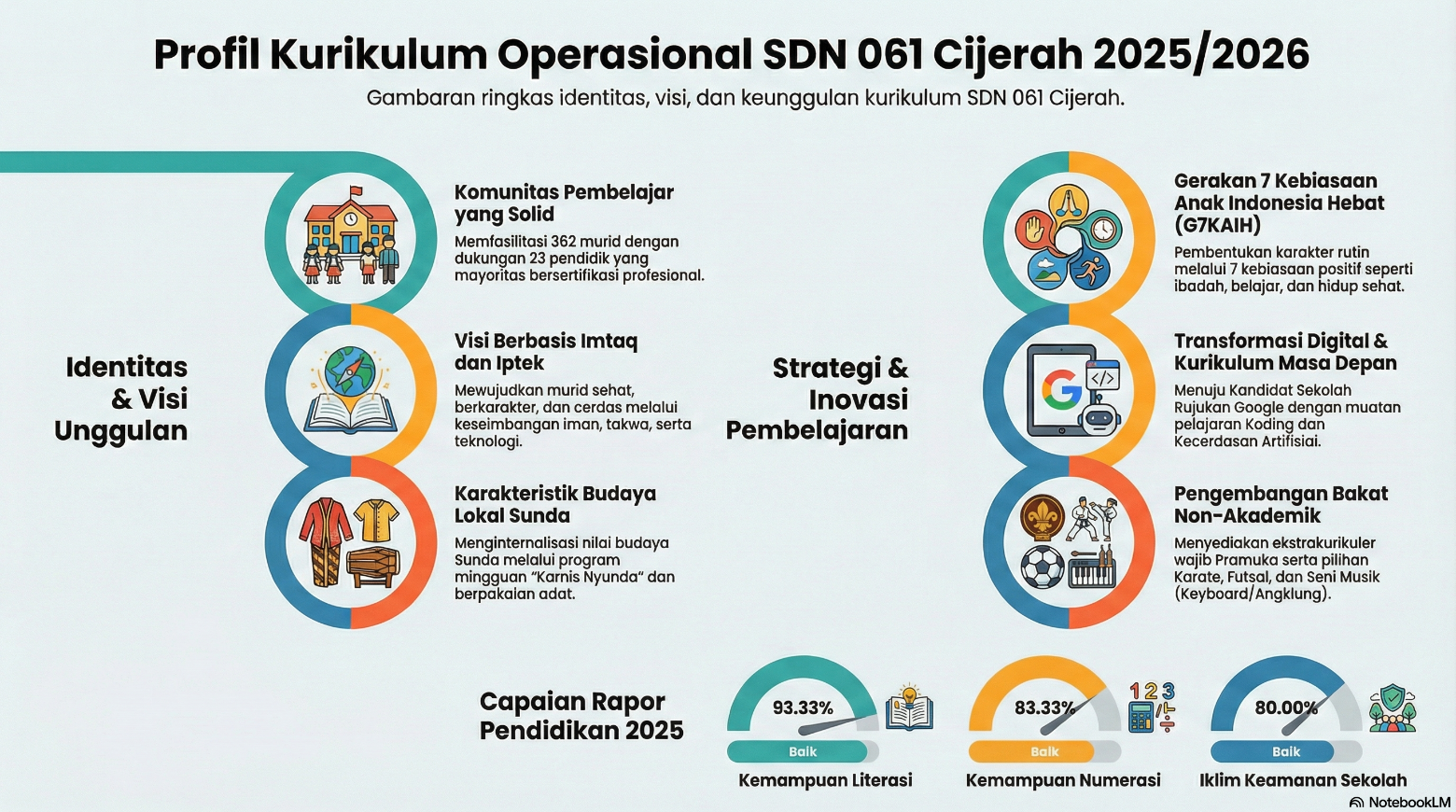 Seiring perkembangan zaman, SDN 061 Cijerah terus melakukan pembenahan dan penguatan mutu pendidikan, baik dari sisi kurikulum, pembelajaran, maupun budaya sekolah. Sekolah mengembangkan pembelajaran yang tidak hanya menekankan aspek akademik, tetapi juga penguatan iman dan takwa, karakter, literasi, numerasi, serta kecakapan abad ke-21.